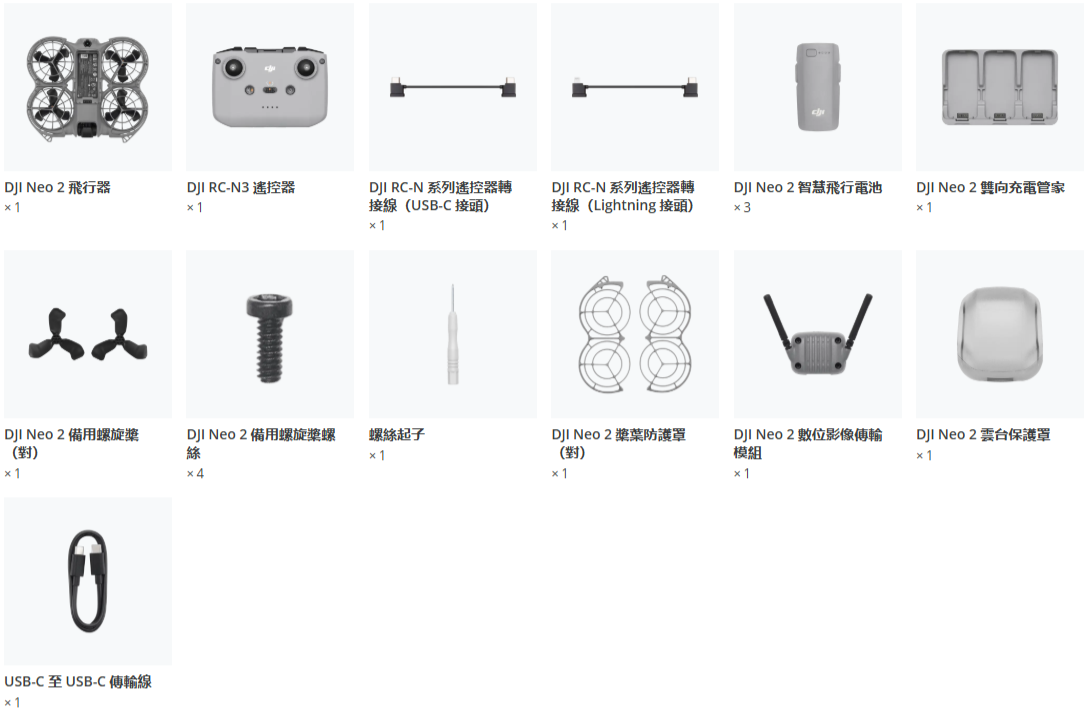DJI Neo 2 Drone 暢飛套裝(配 DJI RC-N3 遙控器)|151g 超輕機身 + 全向避障 + 4K 增穩錄影,飛行更穩定,創作更自由! DJI Neo 2 暢飛套裝(遙控器版) 是 DJI 最新推出的迷你航拍機組合,包含 Neo 2 飛行器、三顆智慧電池、雙向充電管家、槳葉保護罩、DJI RC-N3 普通遙控器 等配件,支援 App 操控 + 遙控器操作雙模式,飛行更穩定、操控更精準。 機身僅重 151g,無需註冊即可合法飛行,支援 掌上起降、手勢操控、語音控制 等直覺式操作,搭配 DJI Fly App 或 RC-N3 遙控器皆可完成拍攝與素材管理。搭載 全向避障系統(前視雷射 + 下視紅外 + 單目視覺),飛行更安全穩定。 影像方面,採用 1/2 吋 1200 萬像素感光元件 + 雙軸雲台 + RockSteady 增穩技術 + 地平校正,支援 4K/60fps 橫向錄影、2.7K/60fps 直向錄影、100fps 慢動作錄影,畫面穩定流暢,適合社交媒體創作。 內建 49GB 儲存空間,可錄製約 40 分鐘 4K 影片,支援 Wi-Fi 6 高速傳輸,素材即拍即傳至 DJI Fly App。單顆電池續航約 19 分鐘,搭配雙向充電管家可同時充三顆電池,提升拍攝效率。 • 151g 超輕機身 + 全包槳葉保護罩 — 無需註冊,安全便攜 • 全向避障 + 掌上起降 + 手勢操控 + 語音控制 — 新手友好,操作直覺 • 配備 DJI RC-N3 普通遙控器 — 操控更穩定,飛行更精準 • 雙軸雲台 + RockSteady 增穩 + 地平校正 — 畫面穩定,飛行流暢 • 4K/60fps 錄影 + 2.7K 直向影片 + 100fps 慢動作 — 社交媒體拍攝首選 • 49GB 內建儲存 + Wi-Fi 6 快速傳輸 — 即拍即傳,素材管理更方便 • 三顆電池 + 雙向充電管家 + 19 分鐘續航 — 飛行時間更充足
