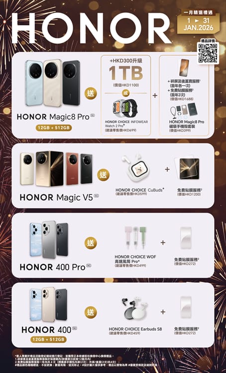 尊享預訂禮遇 (1/1/2026 - 31/1/2026): 1 • 碎屏及後蓋寶服務 (首年各一次) (價值$1278 + $280) *** 免費貼膜服務 (首年2次) (價值$130) *** 2 • Magic8 Pro 磁吸手機殼套裝 (價值$399) *** 3 • HONOR CHOICE INFOWEAR (價值$699) *** 禮品總值 ($2786) 或 加 $ 300 升級至1TB (升級至1TB 不會送HONOR CHOICE INFOWEAR) 預訂禮遇禮品活動登記 : https://near.tl/sm/wFlbXFcRo 禮品數量有限,送完即止。 HONOR 榮耀 Magic8 Pro 5G (12GB+512GB)|旗艦效能 + 5G 高速 + 專業影像系統 HONOR Magic8 Pro 5G 採用 Snapdragon 旗艦級處理器,配合 12GB RAM + 512GB 大容量儲存,多工處理流暢,遊戲、影音、工作一樣輕鬆應付。支援 5G 高速網絡,下載、串流、打機更快更穩定。 配備 超高清 AMOLED 屏幕,色彩鮮明,支援高刷新率,視覺體驗更順暢。相機系統搭載 高像素主鏡頭 + AI 智能拍攝,無論日夜拍攝都能呈現清晰細膩的影像。 內建 長效電池 + 快充技術,全天候使用無憂。機身設計時尚纖薄,兼具美觀與手感,適合日常使用及專業需求。 • Snapdragon 旗艦處理器,效能強勁 • 12GB RAM + 512GB 大容量儲存 • 支援 5G 高速網絡,下載更快更穩定 • 超高清 AMOLED 屏幕,高刷新率流暢體驗 • 專業影像系統,高像素主鏡頭 + AI 拍攝 • 長效電池 + 快充技術,全天候使用