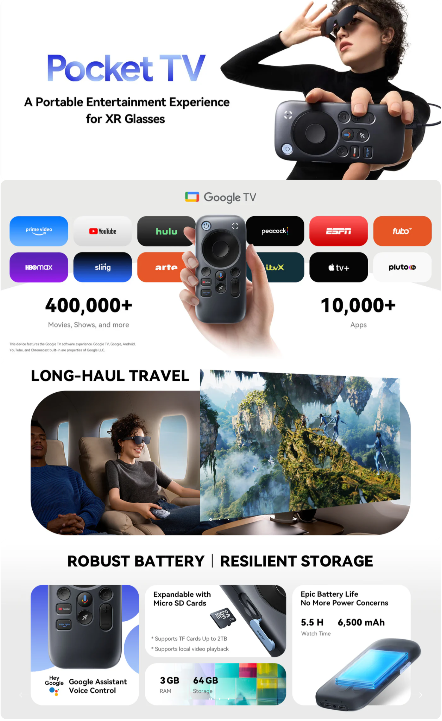 RayNeo 雷鳥 Pocket TV Streaming Media Box|AR 智能眼鏡專用串流媒體盒・隨身電影院體驗 RayNeo 雷鳥 Pocket TV Streaming Media Box 是專為 RayNeo / 雷鳥 AR 智能眼鏡 打造的 便攜式串流媒體盒,讓 AR 眼鏡瞬間變成 隨身大屏電影院。支援主流串流平台、低延遲投屏,無論係睇 Netflix、Disney+、YouTube、打機、投屏,都能享受更沉浸、更流暢的 AR 大屏體驗。 Pocket TV 體積細小、重量輕巧,內置電池可獨立使用,外出、旅行、飛機上都能輕鬆享受私人影院。支援 USB‑C 直連 AR 眼鏡,無需手機、無需額外設定,即插即用。 AR 眼鏡專屬串流媒體盒 • 專為 RayNeo / 雷鳥 AR 智能眼鏡設計 • 直連眼鏡即可播放內容 • 免手機、免電腦、免複雜設定 支援主流串流平台 • Netflix • Disney+ • YouTube • Amazon Prime Video • HBOMAX • 各類 APK 安裝 • 讓 AR 眼鏡變成真正的「私人影院」 內置電池・隨身使用 • 無需外接電源 • 適合飛機、酒店、咖啡店、戶外使用 • 真正做到「隨身 Pocket TV」 輕巧便攜設計 • 體積細小、重量輕 • 易於放入口袋、背包 • 搭配 AR 眼鏡使用更方便 多種連接方式 • USB‑C 直連 AR 眼鏡 • 支援藍牙 / Wi‑Fi • 可連接手掣、耳機、鍵盤等配件 娛樂 + 工作雙模式 • 追劇、睇片、玩遊戲 • 投屏簡報、文件瀏覽 • 適合商務人士與娛樂用家