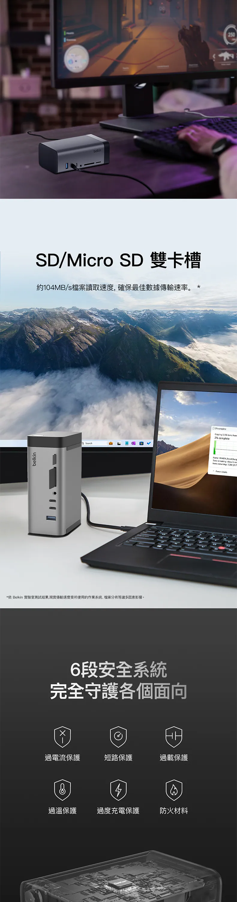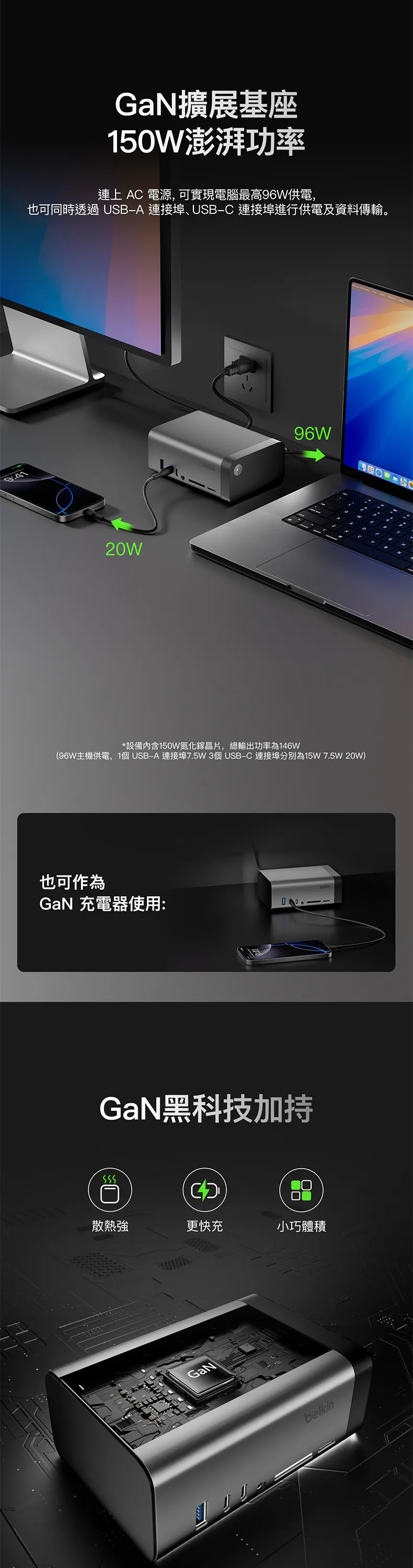 GaN 技術為您帶來安全又高效率的充電體驗,裝置提供 146W 電力輸出,能為主機裝置提供最高 96W 的電力,以及為周邊提供最高 50W 的電力,確保為裝置提供最佳電力分配和高速效能。
