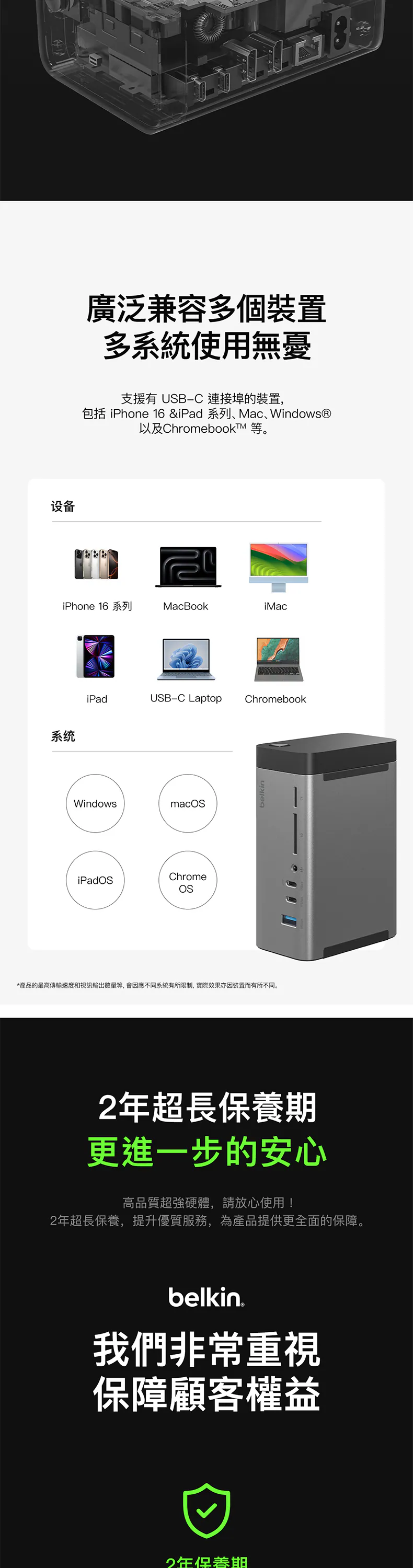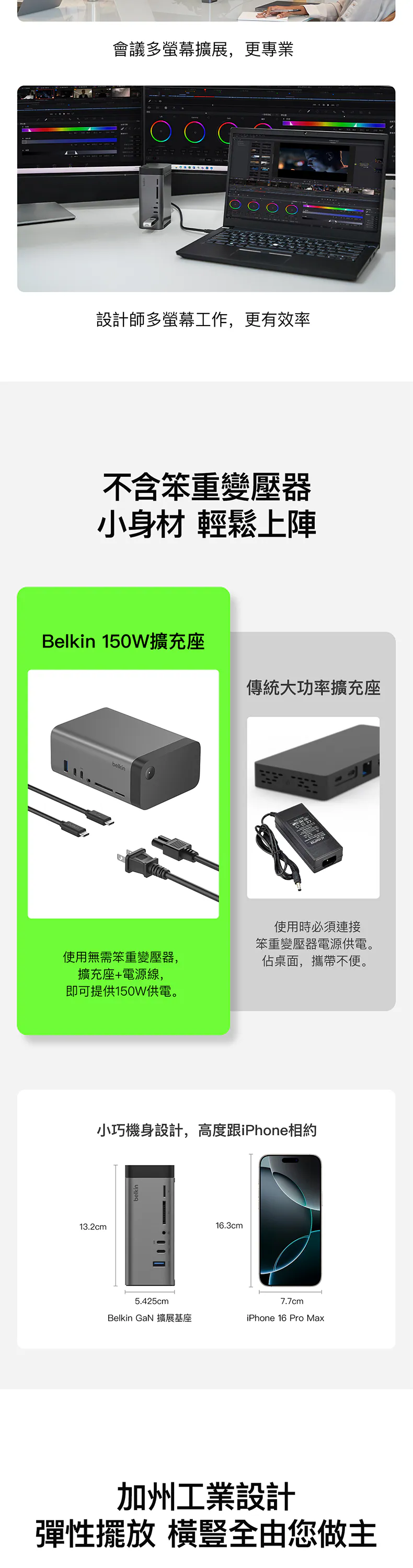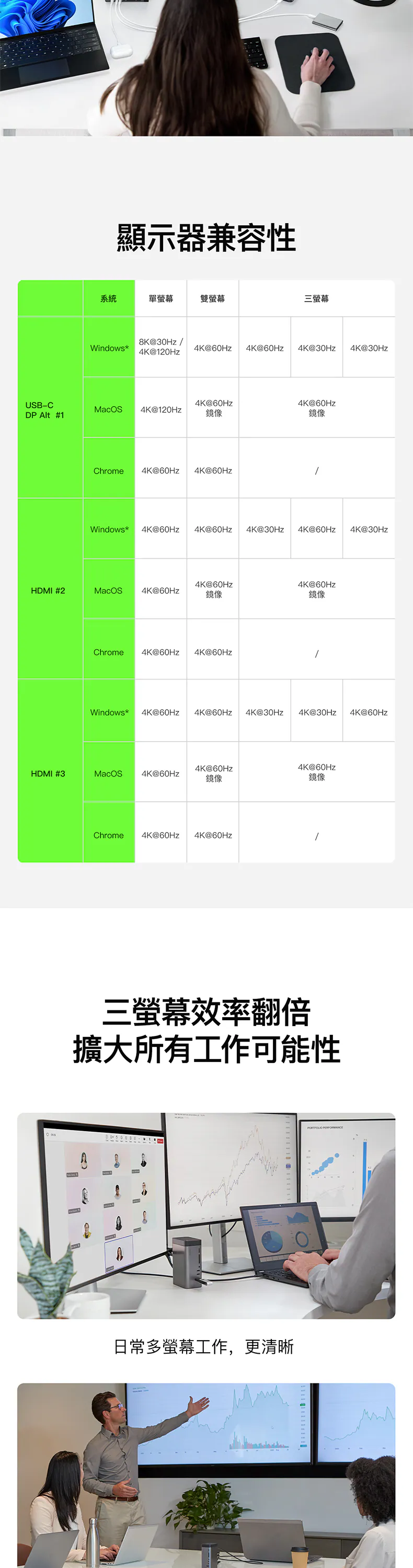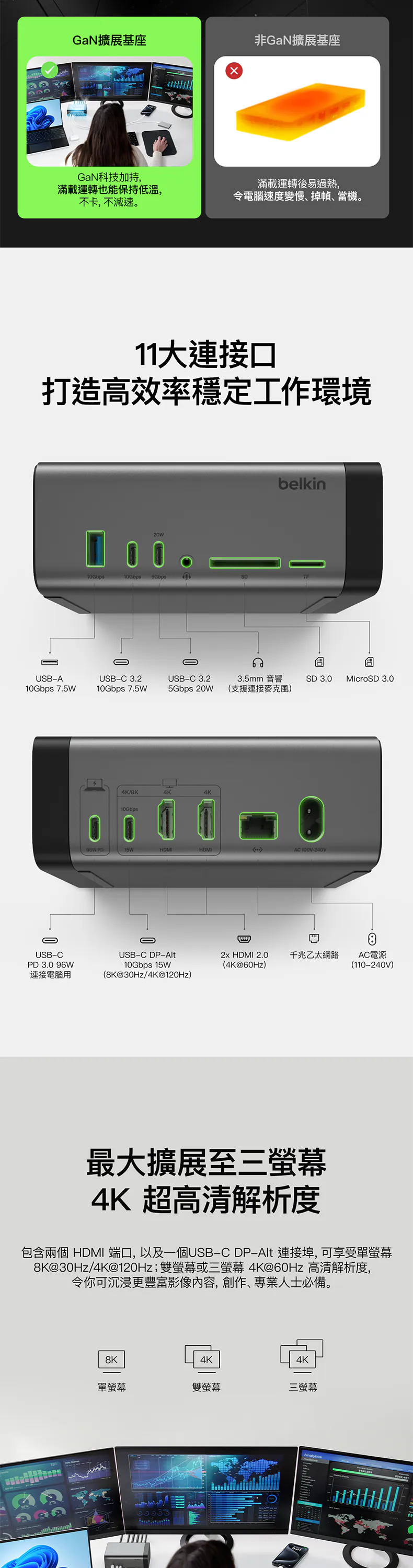 我們的擴展基座可連接到至少 3 部外部顯示器。單一顯示器可獲得高達 8K@30Hz 的畫質、雙顯示器可獲得高達 4K@60Hz 的畫質,而三顯示器也可獲得高達 4K@60Hz 的畫質,讓您享有令人驚艷的畫質,最適合處理高清多工作業等工作。