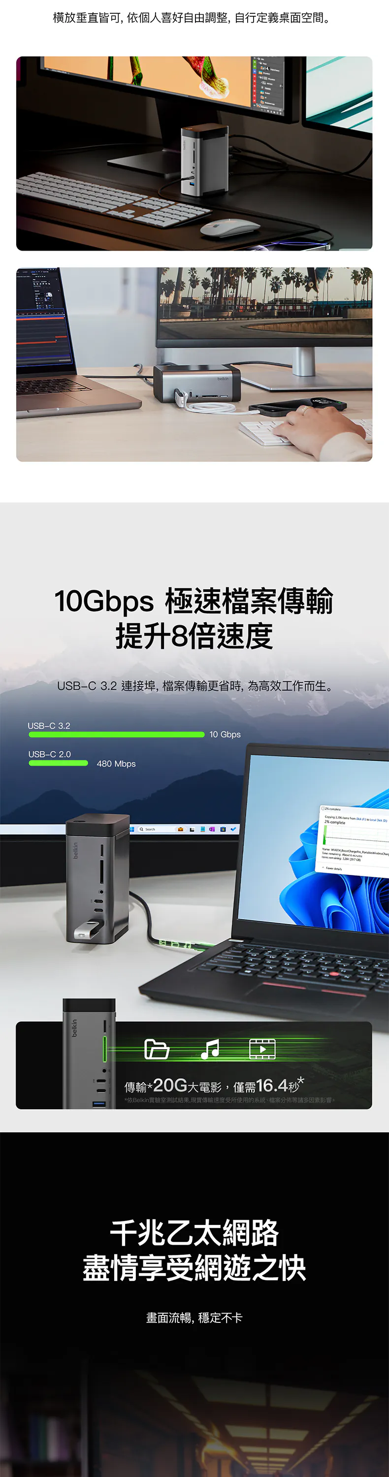 快如閃電的資料傳輸速度最高可達 10Gbps,您可以在最短的延遲時間上載影像和影片檔案,能滿足您對高效率檔案管理、快速備份和流暢多媒體傳輸的要求。