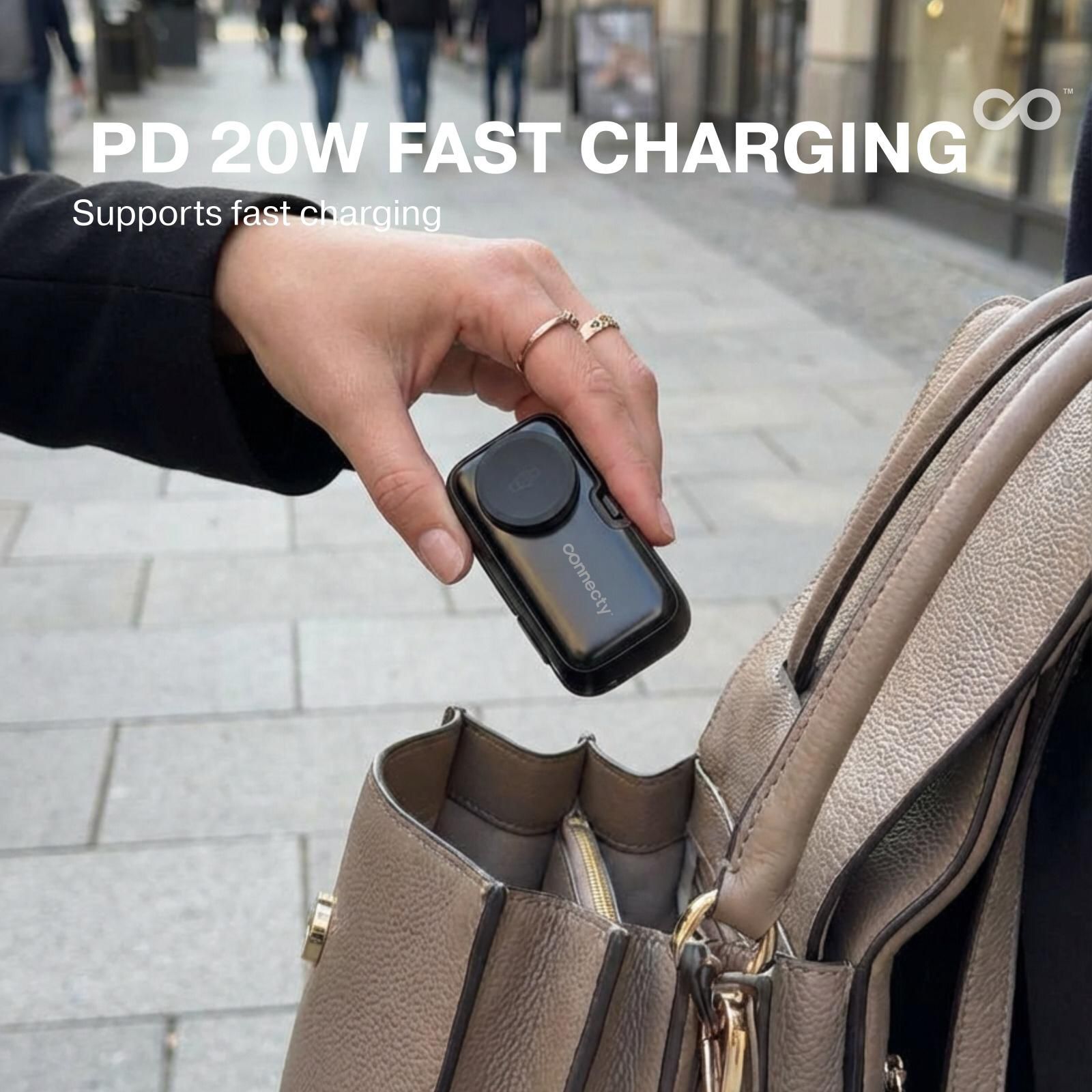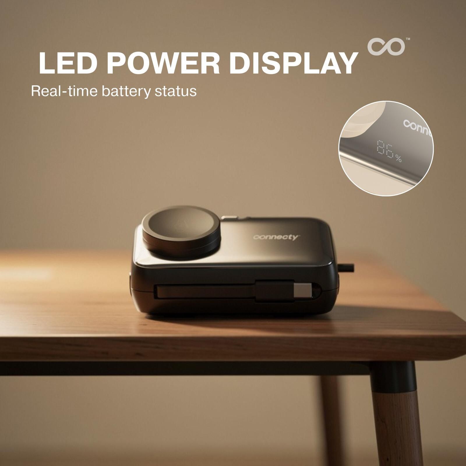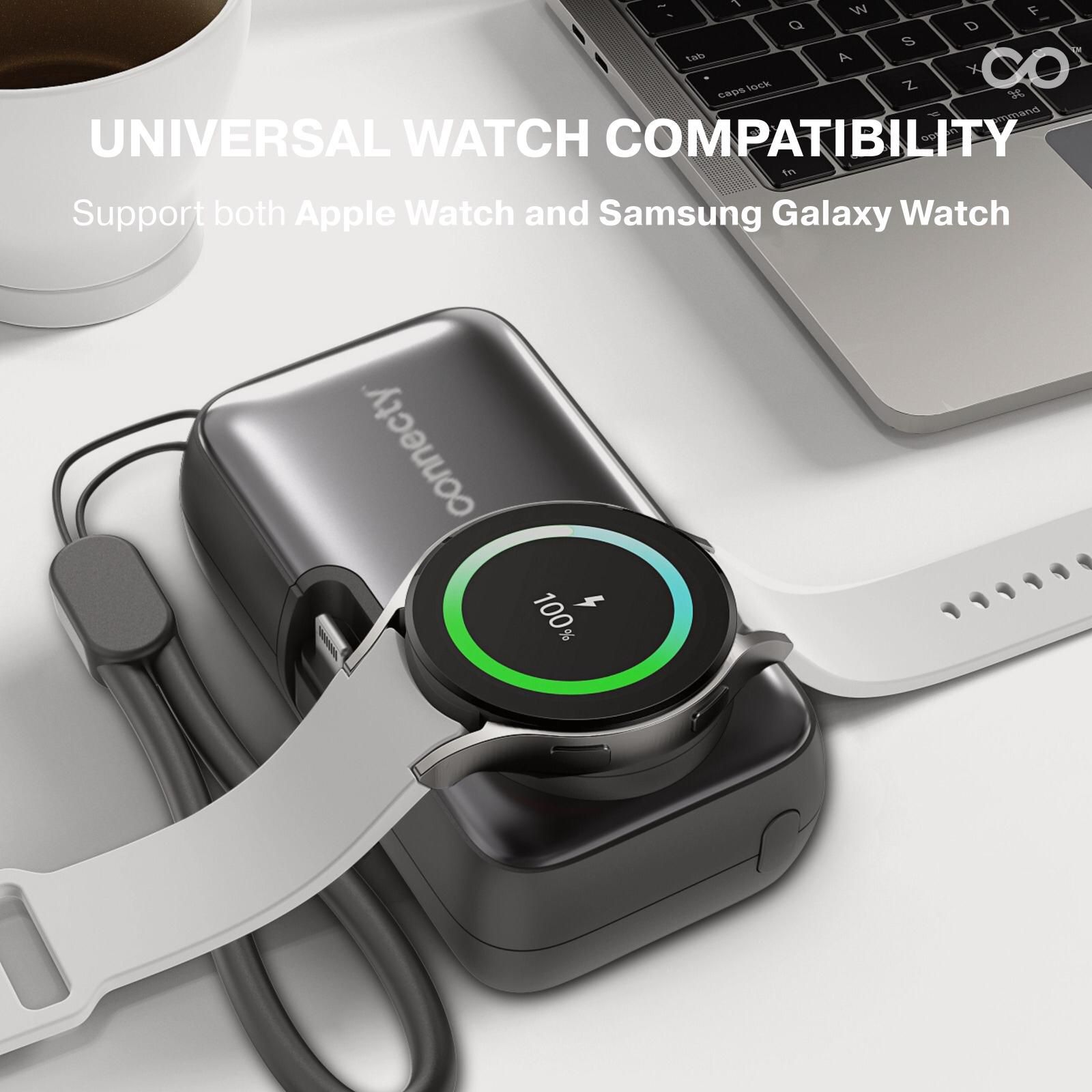 Connecty Power Trio 5000mAh 四合一移動電源|多接口 + 安全快充 + 輕巧便攜 Connecty Power Trio 5000mAh 四合一移動電源 通過 CCC 安全認證,確保使用穩定可靠。內建 5000mAh 高效鋰電池,能為智能手機、手錶、耳機及其他電子設備提供持久電力。 最大特色是 四合一設計,同時配備 Type-C、Lightning、Apple Watch 及 Galaxy Watch 輸出接口,免去攜帶多條充電線的麻煩,真正做到一機多用。支援 快充技術,能快速為設備補充電力,提升使用效率。 機身採用 輕巧便攜設計,重量僅約 145g,方便隨身攜帶,適合旅行、通勤或日常使用。外殼具備 防火阻燃材質,並內建 多重安全保護 (過充、過放、短路、過熱保護),確保充電安全。 • 5000mAh 容量,日常外出足夠使用 • 四合一接口設計:Type-C、Lightning、Apple Watch、Galaxy Watch • PD20W 快充技術,快速補充電力 • 內置支架設計,充電同時可當手機支架,方便隨時追劇或工作 • CCC 安全認證 + 多重保護,使用更安心 • 輕巧便攜設計,重量僅約 145g