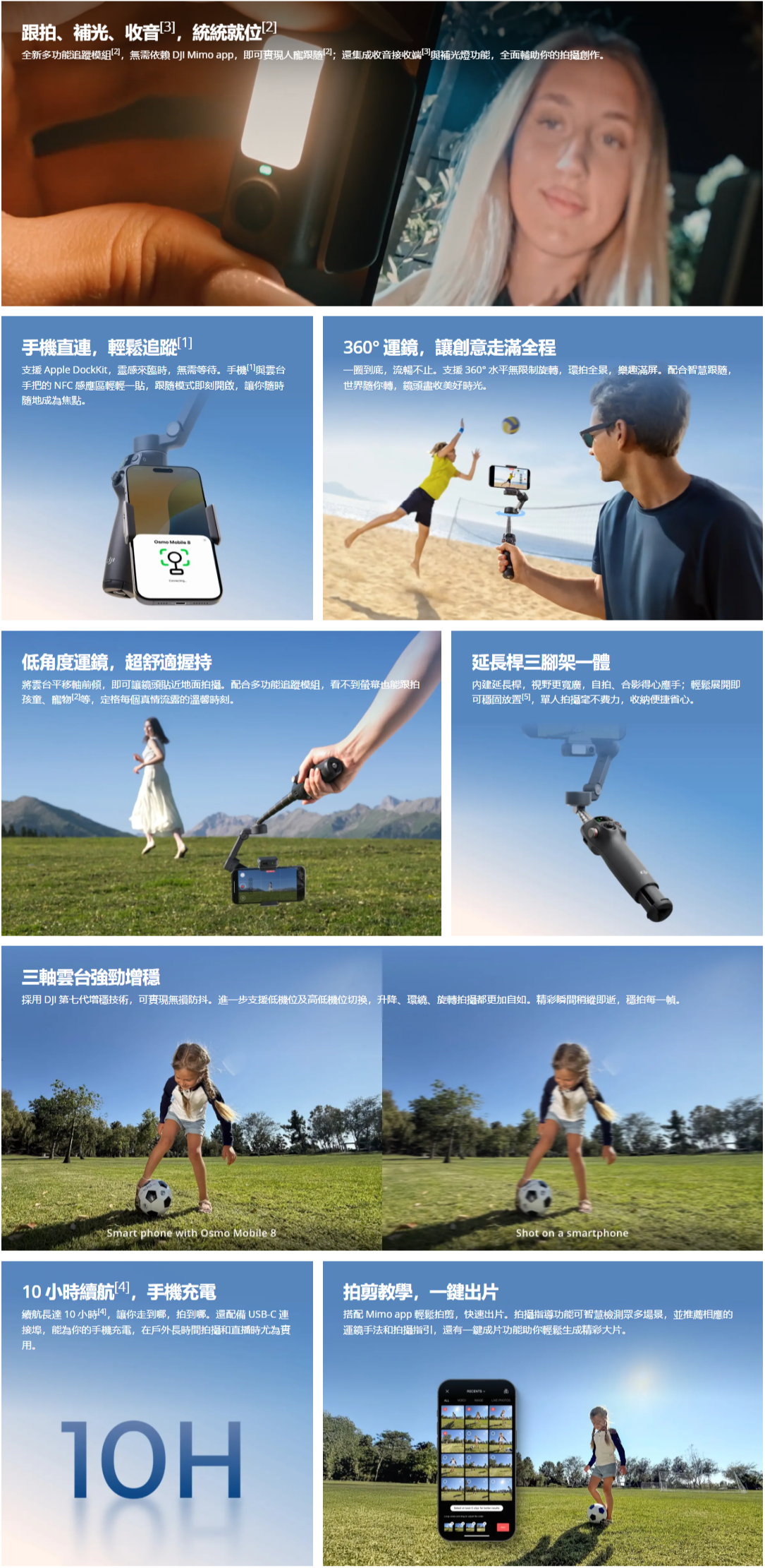 雲台+內建三腳架+磁吸手機 + 多功能追蹤模組:370 克 - 加長桿最大延伸長度