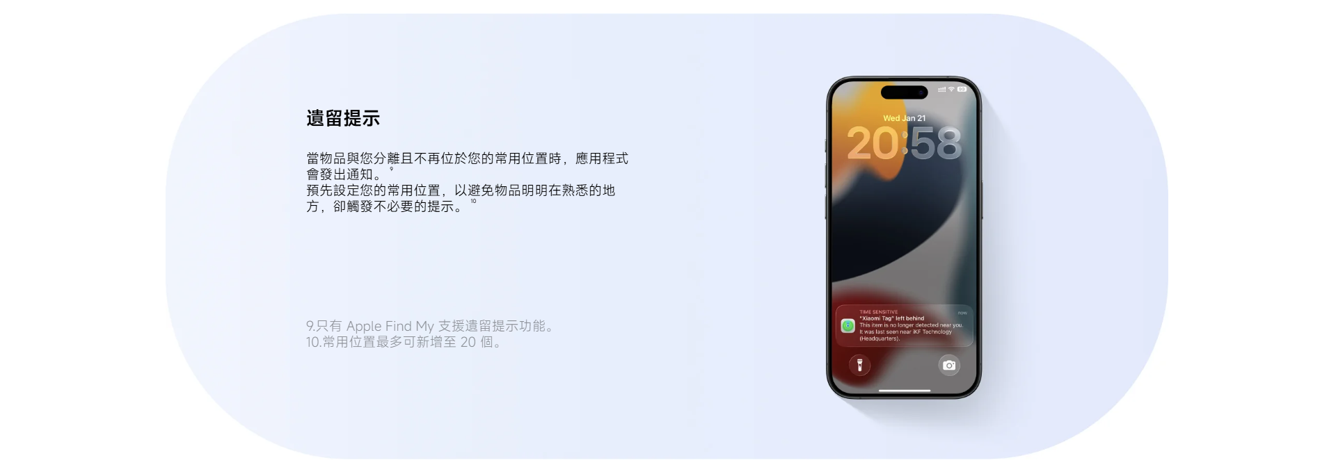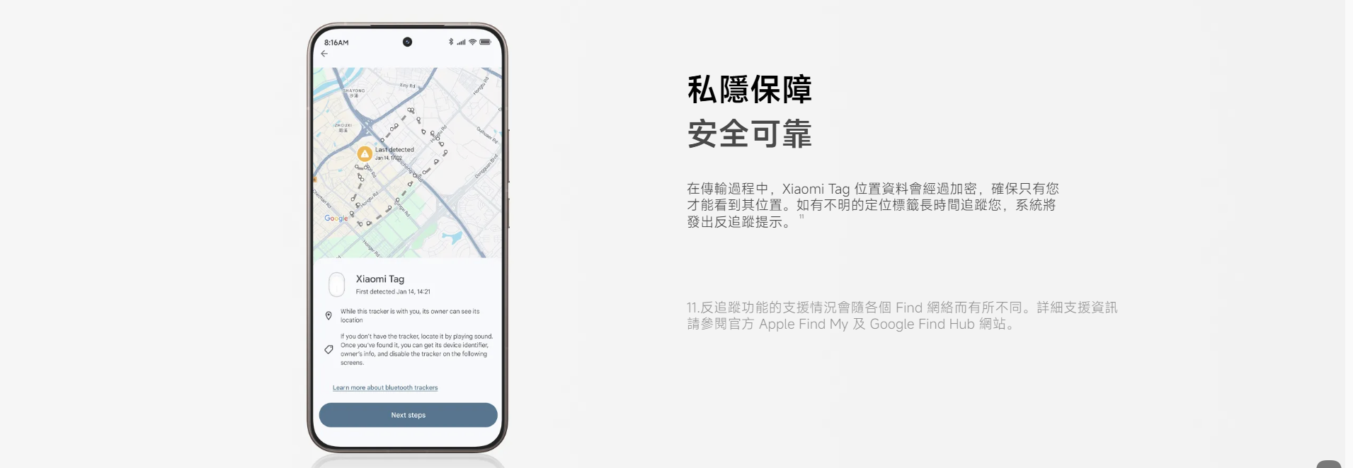 • Apple Find My:透過 Apple Find My 支援運行 iOS 14.5、iPadOS 14.5 或更高版本的 iPhone 及 iPad。