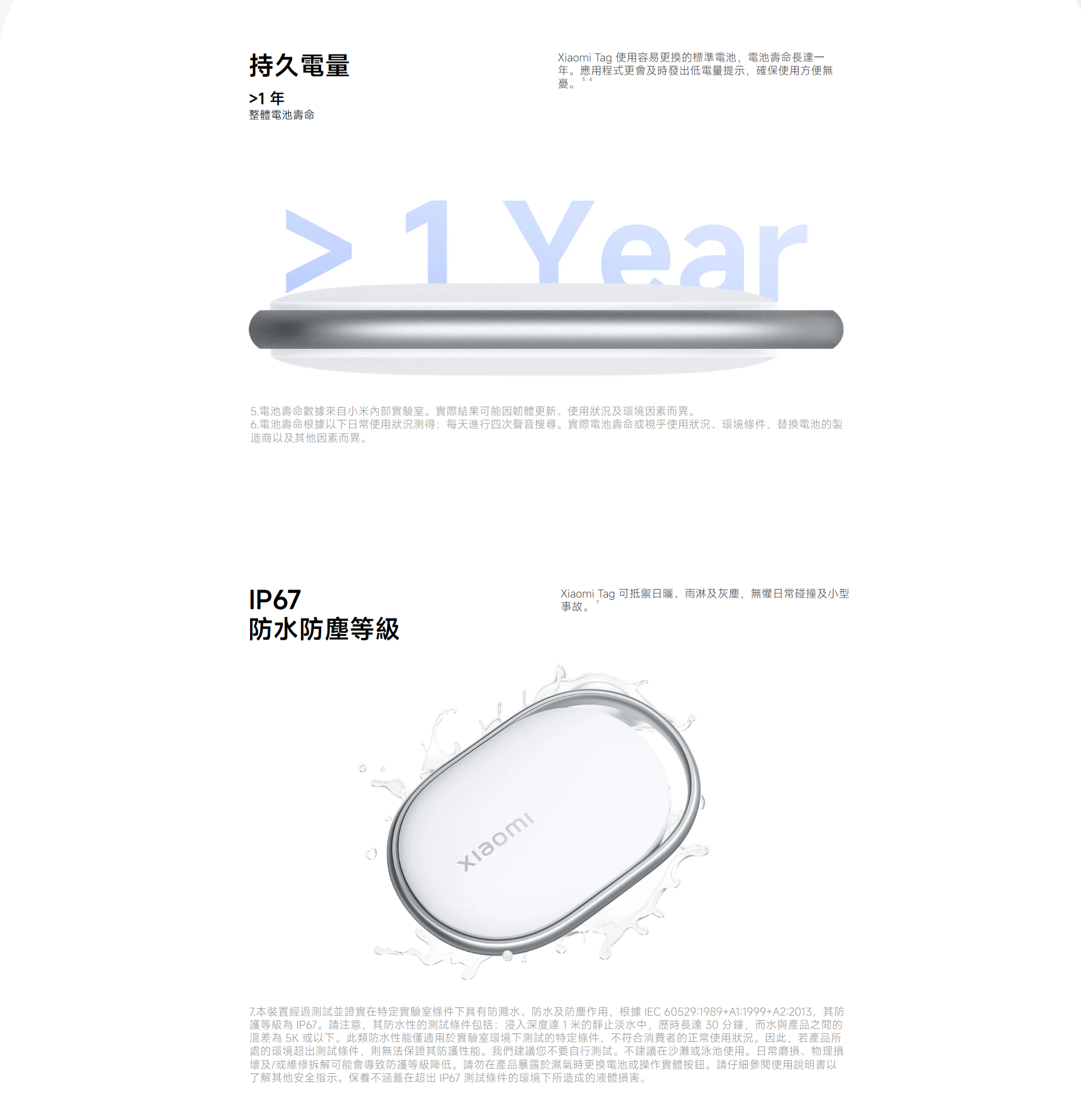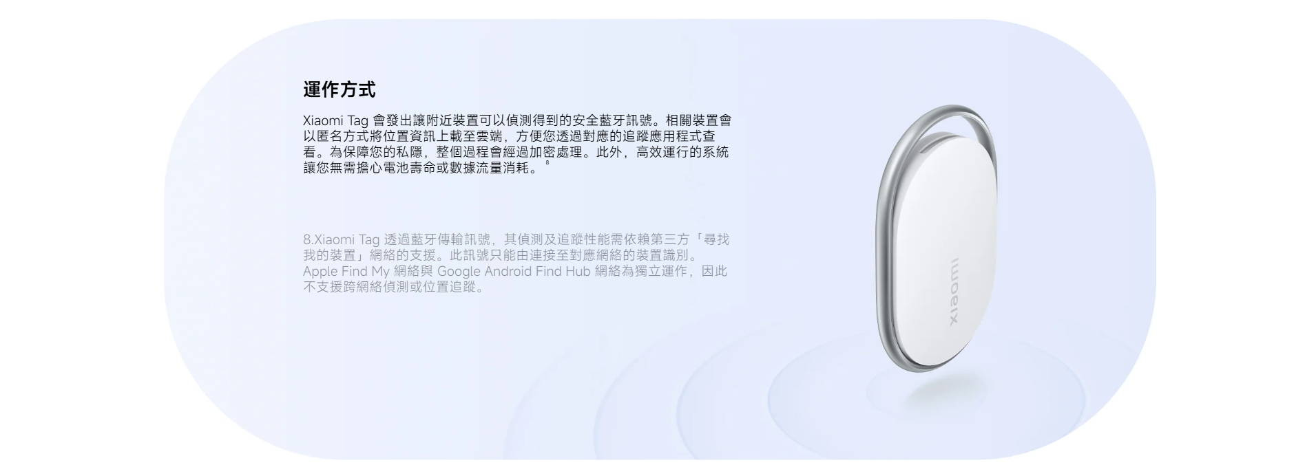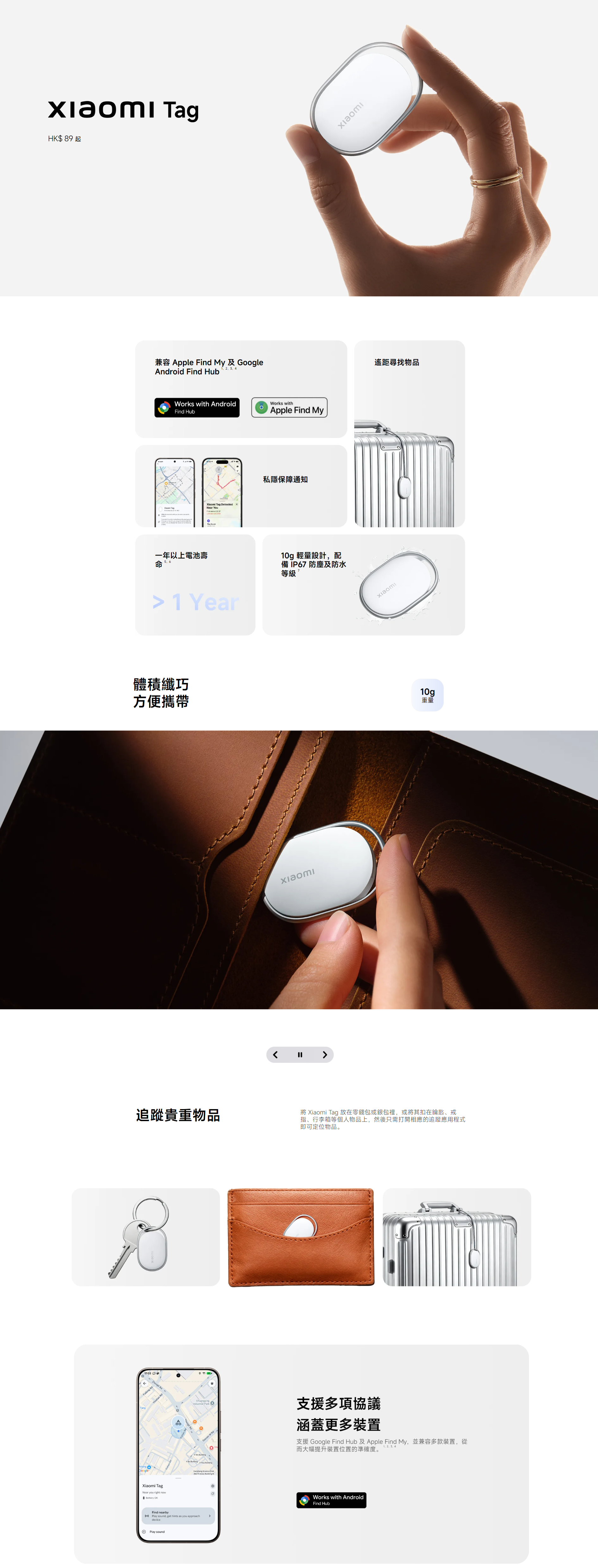 Xiaomi Tag|支援 Apple Find My + Google Find My Device・10g 超輕藍牙追蹤器・一年續航・IP67 防水防塵 Xiaomi Tag 是小米最新推出的 智能藍牙追蹤器,支援 Apple Find My(蘋果尋找) 及 Google Find My Device(Android Find Hub) 兩大定位網絡,真正做到 iOS + Android 跨平台尋物。 機身僅 10g 超輕、支援 藍牙 5.4、NFC、IP67 防水防塵,並具備 一年續航、遺失模式、陌生 Tag 追蹤提醒 等功能,是鑰匙、行李、背包、寵物牌、銀包等物品的最佳防丟神器。 跨平台定位|支援 Apple Find My + Google Find Hub - 同時支援 iOS(Find My) 與 Android(Find My Device) - 可加入全球龐大定位網絡,即使物品遠在千里也能定位 - 位置資料 端對端加密,私隱安全有保障 內置高音量蜂鳴器・藍牙遙控發聲 - 手機一按即可讓 Xiaomi Tag 發聲 - 適合找鑰匙、背包、沙發縫隙掉落的物品 - 聲音響亮,近距離尋找更方便 遺失模式 + NFC 找回功能 - 啟用「遺失模式」後可填寫聯絡方式 - 拾獲者用 iPhone(NFC)或 Android 手機 一碰即可查看聯絡資料 - 大幅提升找回機會 陌生 Tag 追蹤提醒・防止被跟蹤 - 若有陌生 Xiaomi Tag 長時間跟隨你,手機會自動提醒 - 可強制讓陌生 Tag 發聲,確保個人安全 一年續航・可更換 CR2032 電池 - 官方續航長達 1 年 - 使用常見 CR2032 鈕扣電池,更換方便 IP67 防水防塵・戶外無憂 - 可掛於行李、單車、雨傘、寵物牌等戶外物品 - 防塵防水等級達 IP67 10g 超輕設計・隨處可掛 - 重量僅 10g、厚度 7.2mm - 小巧便攜,不佔空間