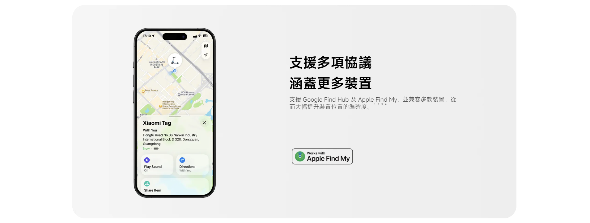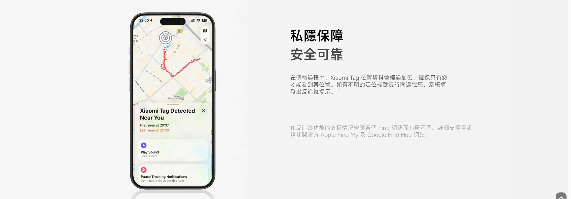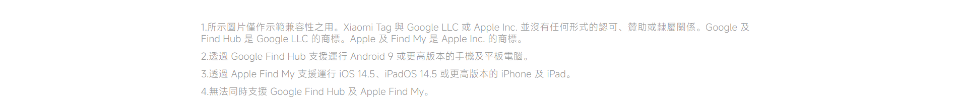 Xiaomi Tag|支援 Apple Find My + Google Find My Device・10g 超輕藍牙追蹤器・一年續航・IP67 防水防塵 Xiaomi Tag 是小米最新推出的 智能藍牙追蹤器,支援 Apple Find My(蘋果尋找) 及 Google Find My Device(Android Find Hub) 兩大定位網絡,真正做到 iOS + Android 跨平台尋物。 機身僅 10g 超輕、支援 藍牙 5.4、NFC、IP67 防水防塵,並具備 一年續航、遺失模式、陌生 Tag 追蹤提醒 等功能,是鑰匙、行李、背包、寵物牌、銀包等物品的最佳防丟神器。 跨平台定位|支援 Apple Find My + Google Find Hub - 同時支援 iOS(Find My) 與 Android(Find My Device) - 可加入全球龐大定位網絡,即使物品遠在千里也能定位 - 位置資料 端對端加密,私隱安全有保障 內置高音量蜂鳴器・藍牙遙控發聲 - 手機一按即可讓 Xiaomi Tag 發聲 - 適合找鑰匙、背包、沙發縫隙掉落的物品 - 聲音響亮,近距離尋找更方便 遺失模式 + NFC 找回功能 - 啟用「遺失模式」後可填寫聯絡方式 - 拾獲者用 iPhone(NFC)或 Android 手機 一碰即可查看聯絡資料 - 大幅提升找回機會 陌生 Tag 追蹤提醒・防止被跟蹤 - 若有陌生 Xiaomi Tag 長時間跟隨你,手機會自動提醒 - 可強制讓陌生 Tag 發聲,確保個人安全 一年續航・可更換 CR2032 電池 - 官方續航長達 1 年 - 使用常見 CR2032 鈕扣電池,更換方便 IP67 防水防塵・戶外無憂 - 可掛於行李、單車、雨傘、寵物牌等戶外物品 - 防塵防水等級達 IP67 10g 超輕設計・隨處可掛 - 重量僅 10g、厚度 7.2mm - 小巧便攜,不佔空間