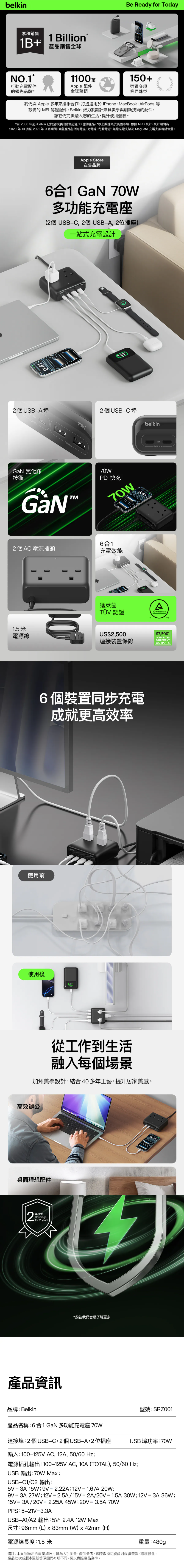 belkin 6 合 1 GaN 多功能充電座 70W(SRZ001my1.5M)|GaN 高效快充・2×USB‑C + 2×USB‑A + 2 位 AC 插座・桌面收納神器 belkin 6 合 1 GaN 多功能充電座 70W(SRZ001my1.5M) 是 Belkin 最新推出嘅 桌面多功能充電站,集 USB‑C 快充、USB‑A、AC 插座 於一身,支援 GaN 高效充電技術,可同時為 手機、平板、筆電、耳機、小家電 供電,係辦公室、家居、書桌必備嘅 多口充電器推薦。 GaN 高效快充技術・最高 70W 輸出 ・採用 GaN 氮化鎵 技術,體積更細、發熱更低 ・USB‑C 單口最高可達 70W(適用 MacBook / iPad / 手機) ・多裝置同時充電仍保持穩定輸出 6 合 1 多功能設計・一個充電座搞掂全部 ・2 × USB‑C PD(支援快充) ・2 × USB‑A ・2 × AC 插座(支援 220–240V) ・手機、平板、耳機、相機、Switch、風扇、檯燈都用得 USB‑C PD 快充・支援多品牌裝置 ・支援 iPhone / Samsung / Pixel / iPad / MacBook / Switch ・iPhone 可達 20W 快充 ・MacBook / iPad 可達 45–70W(視單口輸出而定) 安全保護 6 重防護 ・過流保護 ・過壓保護 ・過熱保護 ・短路保護 ・過載保護 ・GaN 低溫運作更安全 1.5 米電源線・桌面更整齊 ・附 1.5m 加粗電源線 ・桌面線材更易整理 ・適合書桌、床頭櫃、辦公室